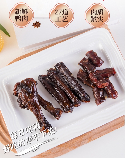 醬板鴨口味香辣濃郁,香而不膩,脆嫩爽口,令人“食之難忘其味,觀之難忘其色?!毙∧绝嗎u板鴨作為新型熟食系列的一種休閑食品,不僅是湖南的一大名菜,也是目前享譽(yù)全國各地的一種特色美食。既可以當(dāng)下酒菜也可以當(dāng)做休閑零食,其味道完全符合廣大上班族和學(xué)生的口味,因此,產(chǎn)品一經(jīng)面世,就備受大眾的喜愛和追捧。