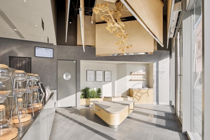 而在以絲綢文化為特色的嘉興桐鄉(xiāng),喜茶則為桐鄉(xiāng)吾悅廣場店打造了包含扎染、織布等場景的主題,這家喜茶門店以“—汀煙雨人江南”為靈感,營造出了極具江南特色的染織坊氛圍。