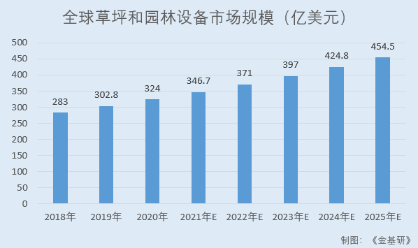 根據(jù)全球市場(chǎng)研究公司(Global Market Insights, Inc.)統(tǒng)計(jì)數(shù)據(jù),2018-2020年,全球草坪和園林設(shè)備市場(chǎng)規(guī)模分別為283億美元、302.8億美元、324億美元,預(yù)計(jì)至2025年將超過(guò)450億美元。