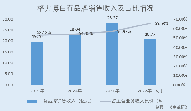 2019-2021年及2022年1-6月,格力博自有品牌銷(xiāo)售收入分別為19.76億元、23.04億元、28.37億元、20.77億元,占主營(yíng)業(yè)務(wù)收入比例分別為53.13%、54.05%、56.97%、65.53%。