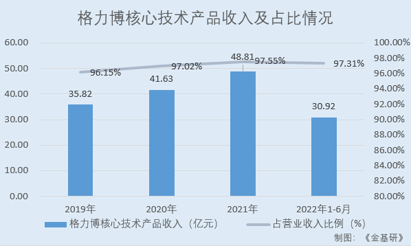 2019-2021年及2022年1-6月,格力博核心技術(shù)產(chǎn)品收入分別為35.82億元、41.63億元、48.81億元、30.92億元,占營(yíng)業(yè)收入的比例分別為96.15%、97.02%、97.55%、97.31%。
