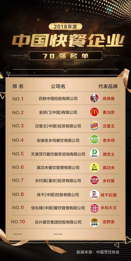 在第23屆中國快餐產(chǎn)業(yè)大會中,中國烹飪協(xié)會發(fā)布了“2018年度中國快餐70強(qiáng)”榜單。老鄉(xiāng)雞榮登中式快餐品牌第 一名,僅次于麥當(dāng)勞、肯德基、漢堡王這三個國際知名快餐品牌之后,成為新晉的國民中式快餐!