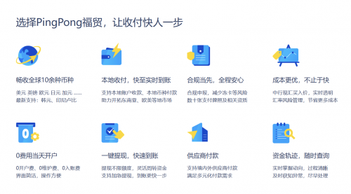 PingPong福貿(mào)全球賬戶支持多達18個主流幣種收款,另外相較于全球賬戶,其歐美本地賬戶有更高的外貿(mào)收款效率、更低的外貿(mào)收款成本以及更便捷的匯款流程,可加速外貿(mào)企業(yè)資金回籠,便利歐美本地客戶,進而提升談單競爭力以及交易轉(zhuǎn)化。