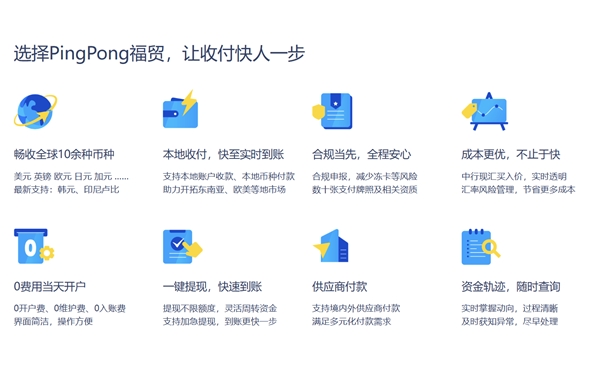 PingPong福貿(mào)從客戶需求角度切實(shí)出發(fā),通過(guò)自身六大核心業(yè)務(wù)優(yōu)勢(shì)——豐富的產(chǎn)品矩陣、合規(guī)的跨境資金收付、全面的安全保障、前沿的科技支撐、定制化的解決方案、貼心的本地化服務(wù),不斷向廣大客戶提供安全高效的跨境支付服務(wù),為企業(yè)降本增效,提升跨境收款服務(wù)便利化,滿足用戶在各類服務(wù)生態(tài)中的綜合資金管理需求。