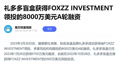 近日,據(jù)美聯(lián)社消息,中國盲盒品牌禮多多成功完成A輪融資,獲得由FOXZZ INVESTMENT領(lǐng)投、多家風(fēng)投機(jī)構(gòu)跟投的8000萬美元投資。此前,禮多多已獲得兩輪共計7700百萬美元的戰(zhàn)略融資。