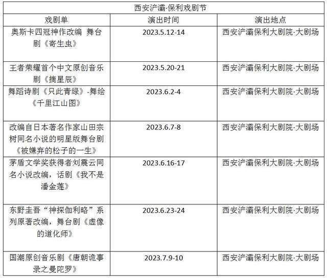 首屆西安浐灞·保利戲劇節(jié)中開(kāi)幕大戲?qū)?guó)際級(jí)IP,奧斯卡四冠神作改編而成的舞臺(tái)劇《寄生蟲(chóng)》搬上中國(guó)舞臺(tái)、隨后舞蹈詩(shī)劇《只此青綠》-舞繪《千里江山圖》,以“展卷人”視角窺見(jiàn)千里江山。茅盾文學(xué)獎(jiǎng)獲得者劉震云同名小說(shuō)改編的話劇《我不是潘金蓮》、改編自日本著名作家山田宗樹(shù)同名小說(shuō)的明星版舞臺(tái)劇《被嫌棄的松子的一生》 、王者榮耀首個(gè)中文原創(chuàng)音樂(lè)劇《摘星辰》等多部經(jīng)典作品都將于5月至7月在西安浐灞保利大劇院展演上映。