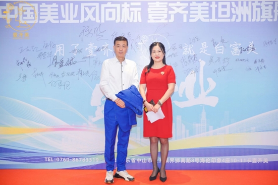 壹齊美總裁譽(yù)軒女士與珠海著名主持人劉團(tuán) 在壹齊美坦洲旗艦店開業(yè)晚宴簽到墻簽名留念。