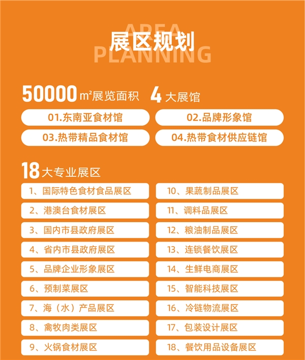 4大展館:東南亞食材館、品牌形象館、熱帶精品食材館、熱帶食材供應鏈館。