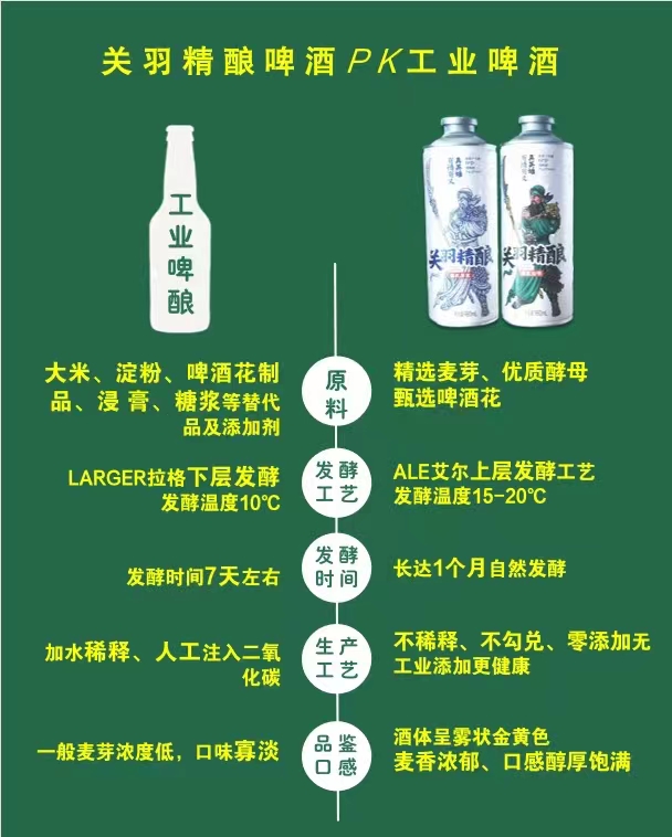 關羽精釀啤酒因釀造手法、工藝的不同而豐富多樣,能滿足大眾在不同場景下的需求,也是留住忠實消費者的差異化優(yōu)勢。原漿白啤,德式原漿兩種口味為消費者帶來豐富的產(chǎn)品體驗,也為經(jīng)銷商加碼精釀渠道提供一個良好的契機!把酒遇知音,舉杯結(jié)情義!關羽精釀啤酒將以匠心品質(zhì)贏戰(zhàn)市場,以品質(zhì)釀造產(chǎn)品,聚焦區(qū)域市場,聚焦消費人群,精耕細作,滿足更多消費者的高品質(zhì)產(chǎn)品需求,成為一款文創(chuàng)啤酒。
