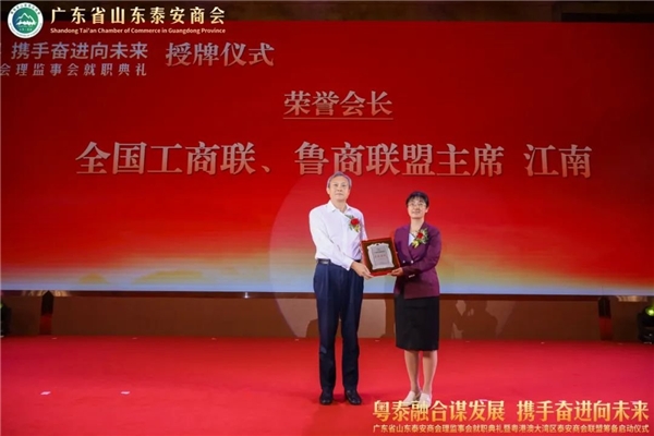 泰安市委常委、統(tǒng)戰(zhàn)部部長成麗同志為江南榮譽會長頒發(fā)牌匾