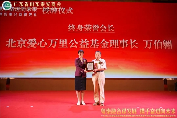 泰安市委常委、統(tǒng)戰(zhàn)部部長成麗為萬伯翱終身榮譽會長頒發(fā)牌匾(由中國國際友好聯(lián)絡會原會長助理、常務理事曹全新代領)