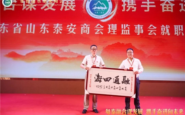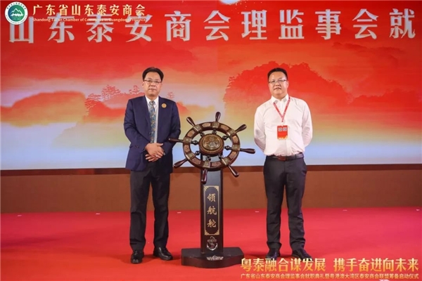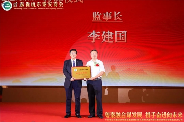 中共泰安市委統(tǒng)戰(zhàn)部、泰安市工商聯(lián)授予李建國同志為粵港澳大灣區(qū)泰安商會聯(lián)盟籌委會主任,泰安市副市長、工商聯(lián)主席馮能斌為李建國主任頒發(fā)牌匾;同時授予廣東省山東泰安商會為“泰安市雙招雙引工作站”,廣東省山東泰安商會會長秦亮上臺接牌。