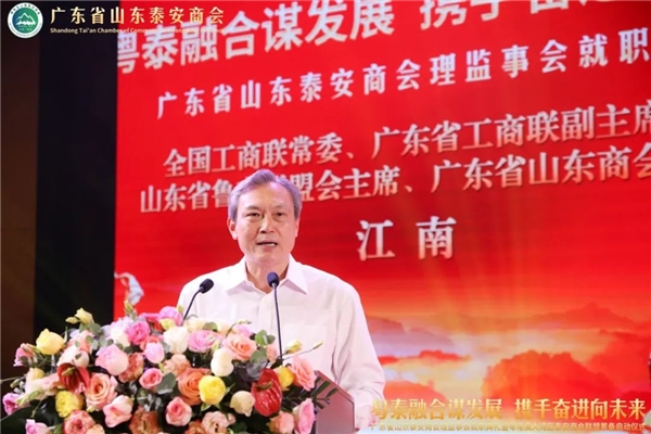 全國工商聯(lián)常委、廣東省工商聯(lián)副主 席、山東省魯商聯(lián)盟會主 席、廣東省山東商會會長江南講話。他說,在這火熱的夏季,今天大家相聚在美麗的羊城廣州,參加廣東省山東泰安商會理監(jiān)事就職典禮和粵港澳大灣區(qū)泰安商會聯(lián)盟籌備啟動儀式,這是具有歷史紀念意義的好事、喜事。