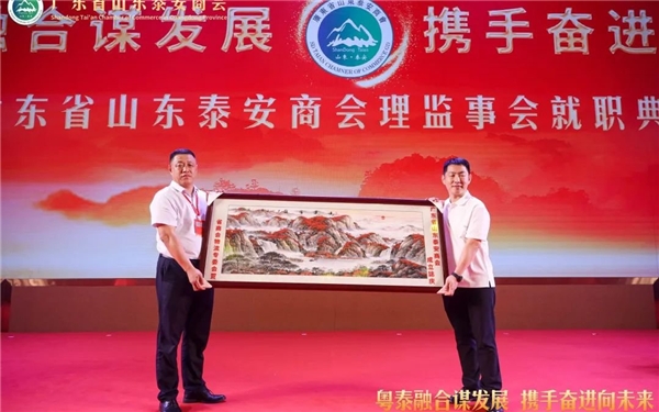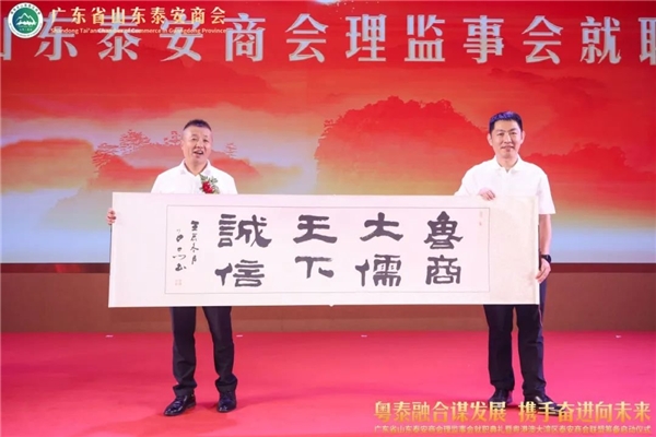 泰安市政協(xié)常委、市總商會副會長、泰山商會執(zhí)行會長、全國泰安商會聯(lián)盟秘書長徐濤(左)向廣東省山東泰安商會贈送墨寶