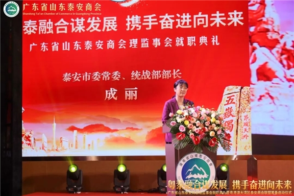 泰安市委常委、統(tǒng)戰(zhàn)部成麗部長講話。她指出,廣東省山東泰安商會和粵港澳大灣區(qū)泰安商會聯(lián)盟籌委會的成立,是廣東、泰安兩地商會發(fā)展的大事、喜事,架起了粵港澳地區(qū)與泰安聯(lián)絡溝通、合作交流的新橋梁。希望廣東省山東泰安商會全面加強自身建設,充分履行職責,積極發(fā)揮作用,多做聯(lián)絡聯(lián)誼、牽線搭橋、助推發(fā)展的工作,不斷提高商會的組織向心力、成員凝聚力和社會貢獻力。希望粵港澳大灣區(qū)泰安商會聯(lián)盟籌委會加快推進聯(lián)盟組建進程,充分聯(lián)絡吸納粵港澳大灣區(qū)優(yōu)秀企業(yè)家加入組織,通過產業(yè)協(xié)同、資源互通、交流合作等方式,聚合資源優(yōu)勢,放大集群效應,打造國內一流的商會聯(lián)盟平臺,為粵港澳地區(qū)和泰安改革發(fā)展增添新的動力。