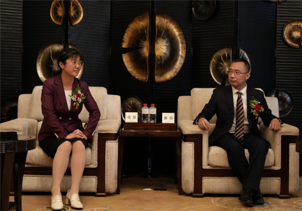 中共泰安市委常委、統(tǒng)戰(zhàn)部部長成麗(左),廣東省山東泰安商會會長秦亮(右)