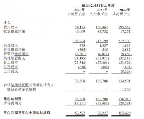 在收益方面,根據(jù)弗若斯特沙利文的資料,截至2022年12月31日,博將資本的基金實現(xiàn)了18.7%的強(qiáng)勁整體內(nèi)部收益率,高于業(yè)內(nèi)基金的平均水平。截至2022年12月31日,在系列中,專項系列實現(xiàn)了27.0%的最 高內(nèi)部收益率。截至2022年12月31日,博將資本已全部或部分退出對七家公司的投資,總投資成本約為4.34億元,實現(xiàn)的退出價值約為12億元,MOIC(投資收益倍數(shù))約2.8倍。同時,博將資本的19家投資組合公司正在籌備于可預(yù)見未來上市或計劃上市。招股書顯示,在過去的2020年、2021年和2022年,博將資本的收入分別為1.22億、2.15億和2.12億元人民幣,相應(yīng)期間的凈利潤分別為0.54億、0.99億和1.07億元人民幣,年復(fù)合增長率為41.6%。