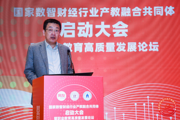 教育部職業(yè)教育與成人教育司副司長謝俐在會上作主旨報告。他指出,深化產(chǎn)教融合是現(xiàn)代職業(yè)教育體系改革的主線,產(chǎn)教融合體制機制的創(chuàng)新實踐一直是現(xiàn)代職業(yè)教育的核心議題,數(shù)字化轉型是金融財經(jīng)的行業(yè)重點發(fā)展方向。他表示,國家數(shù)智財經(jīng)行業(yè)產(chǎn)教融合共同體成立大會的舉辦是貫徹落實黨的二十大決策部署,落實教育部相關政策文件的重要舉措,是在職業(yè)教育新發(fā)展階段打造產(chǎn)教融合新載體、新范式的有益探索。
