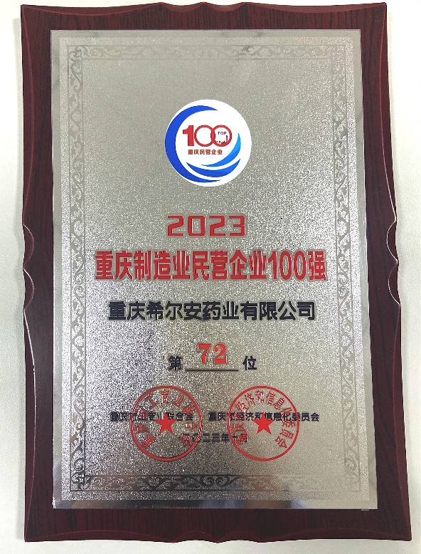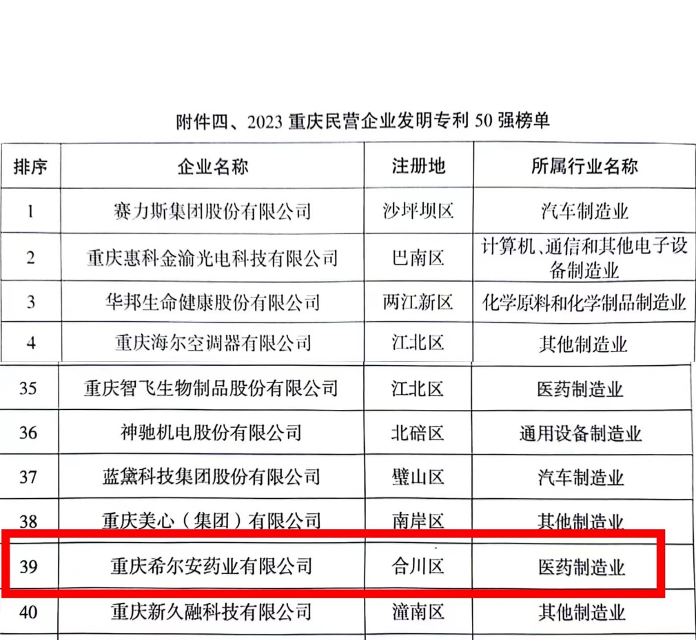 2023年10月17日,重慶市工商業(yè)聯(lián)合會(huì)、市科學(xué)技術(shù)局、市經(jīng)濟(jì)和信息化委員會(huì)聯(lián)合舉辦2023重慶民營企業(yè)100強(qiáng)發(fā)布會(huì),會(huì)上發(fā)布了多個(gè)榜單排名。重慶希爾安藥業(yè)有限公司(簡稱希爾安藥業(yè))榮登2023制造業(yè)民營企業(yè)100強(qiáng)榜第72名,2023重慶民營企業(yè)科技創(chuàng)新指數(shù)100強(qiáng)榜第28名,以及科技創(chuàng)新指數(shù)100強(qiáng)榜首次發(fā)布的“2023重慶民營企業(yè)發(fā)明專利50強(qiáng)”專項(xiàng)子榜單第39名。