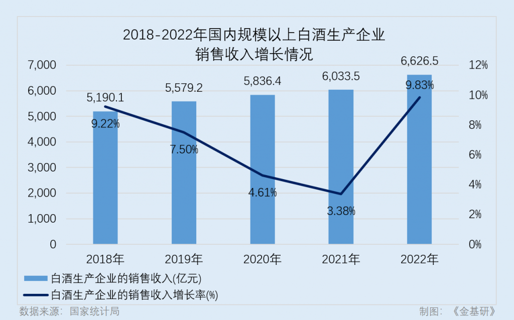 數(shù)據(jù)顯示,2018-2022年,國內規(guī)模以上白酒生產企業(yè)的銷售收入分別為5,190.1億元、5,579.2億元、5,836.4億元、6,033.5億元、6,626.5億元,2022年規(guī)模以上白酒生產企業(yè)的銷售收入較同期增長9.83%。
