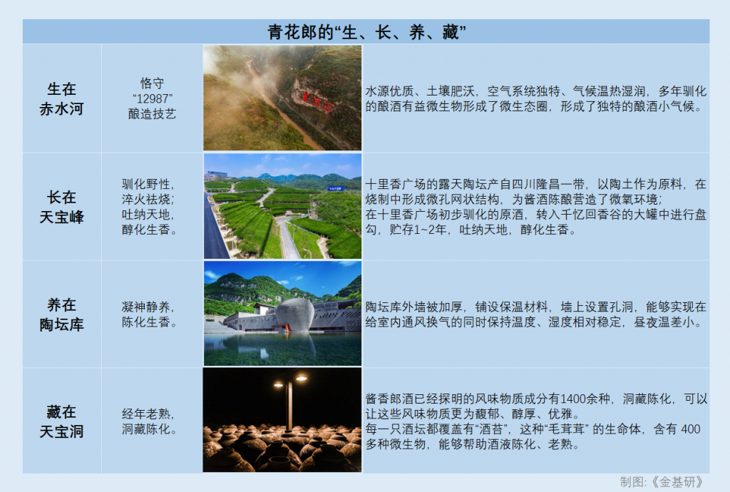 在赤水河邊釀造、在天寶峰上成長、在陶壇庫里靜養(yǎng)、在天寶洞中修煉洞藏,以特級酒為體,以20年以上陳年酒及調味酒為魂,青花郎醬香突出、幽雅細膩、酒體醇厚,具有行業(yè)好的回味。