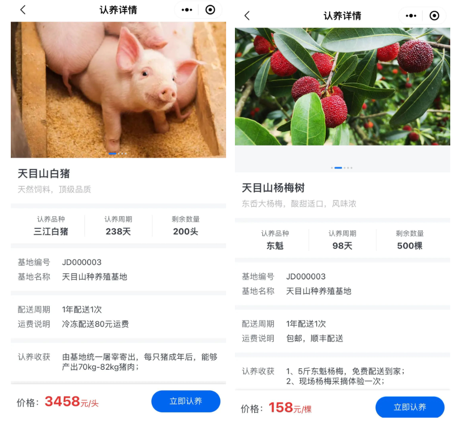 面向消費(fèi)者:認(rèn)養(yǎng)小程序。通過認(rèn)養(yǎng)小程序,消費(fèi)者消費(fèi)者可以在線選擇基地認(rèn)養(yǎng)感興趣的農(nóng)產(chǎn)品,包括水果、蔬菜、畜牧產(chǎn)品等,與農(nóng)戶在線簽約,通過電子簽章與合同上區(qū)塊鏈等技術(shù),獲取有效的認(rèn)養(yǎng)憑證。