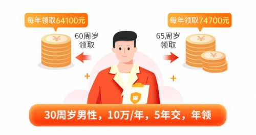 以30周歲男性投保福滿滿2號養(yǎng)老年金險,年交保費10萬,交5年為例,該消費者規(guī)劃從60周歲起開始按年領(lǐng)取養(yǎng)老金,每年可以領(lǐng)取64,100元;若想延后幾年,從65周歲再開始領(lǐng)取,則每年可以領(lǐng)取74,700元,在同等繳費條件下,消費者起始領(lǐng)取年齡越晚,可領(lǐng)取的養(yǎng)老金金額就越高。