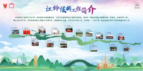 2007年4月,江鈴汽車(chē)聯(lián)合中國(guó)鄉(xiāng)村發(fā)展基金會(huì)、中國(guó)汽車(chē)報(bào)社、中國(guó)汽車(chē)新聞工作者共同發(fā)起了“江鈴·溪橋工程”公益項(xiàng)目,旨在為我國(guó)部分經(jīng)濟(jì)欠發(fā)達(dá)地區(qū)提供資金,援建便民橋,解決出行難。十幾年過(guò)去了,截止目前,江鈴汽車(chē)為項(xiàng)目投入資金3870多萬(wàn)元,“江鈴溪橋”的足跡遍布全國(guó)25個(gè)?。ㄊ?、自治區(qū))的128個(gè)縣,442座便民橋?yàn)?0余萬(wàn)欠發(fā)達(dá)地區(qū)的人們架起了“希望”。