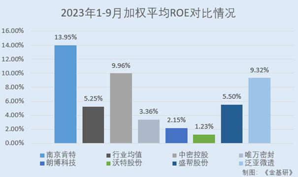 其中,2023年1-9月,中密控股的加權(quán)平均ROE為9.96%;唯萬密封的加權(quán)平均ROE為3.36%;朗博科技的加權(quán)平均ROE為2.15%;沃特股份的加權(quán)平均ROE為1.23%;華日新材的加權(quán)平均ROE為6.03%;盛幫股份的加權(quán)平均ROE為5.50%;泛亞微透的加權(quán)平均ROE為9.32%。一通密封、華日新材尚未披露其2023年1-9月財(cái)務(wù)數(shù)據(jù),故剔除(下同)。