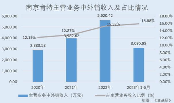 2020-2022年及2023年1-6月,肯特股份主營業(yè)務(wù)中的外銷收入分別為2,888.58萬元、3,982.62萬元、5,620.42萬元、3,095.99萬元,占主營業(yè)務(wù)收入的比例分別為12.19%、12.87%、15.32%、15.88%。