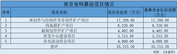 此番上市,肯特股份擬募資3.52億元,分別用于“密封件與結(jié)構(gòu)件等零部件擴(kuò)產(chǎn)項(xiàng)目”、“四氟膜擴(kuò)產(chǎn)項(xiàng)目”、“耐腐蝕管件擴(kuò)產(chǎn)項(xiàng)目”、“研發(fā)中心建設(shè)項(xiàng)目”及“補(bǔ)充流動(dòng)資金項(xiàng)目”。