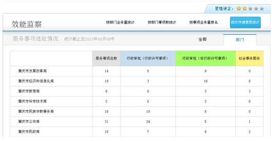 (4)事項(xiàng)辦理全程監(jiān)控:申請(qǐng)人可以對(duì)事項(xiàng)進(jìn)行網(wǎng)上咨詢、進(jìn)度查詢和結(jié)果查詢,并對(duì)服務(wù)進(jìn)行星級(jí)評(píng)定。監(jiān)察部門(mén)全程跟蹤,對(duì)逾期辦理的部門(mén)進(jìn)行警告和處理。