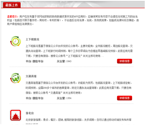 (2)提供專門的"APP應(yīng)用"欄目,社會(huì)力量可以通過(guò)該欄目上傳基于該網(wǎng)站獲取的政府?dāng)?shù)據(jù)資源開發(fā)的APP應(yīng)用,供用戶下載使用。目前,該欄目已上傳"上下班路況"、"交通英雄"、"游北京"、"愛健康"等應(yīng)用。
