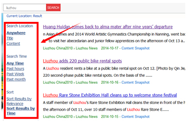 (2)部署新的檢索功能,可實現(xiàn)對搜索結(jié)果進(jìn)行按"搜索位置"、"搜索時間"進(jìn)行排序,并且可以按照信息的"相關(guān)度"進(jìn)行排序,使訪問者可以很輕易的搜索到自己所需的信息,避免了在搜索出結(jié)果后仍需從海量信息中無序的查找精確的結(jié)果。