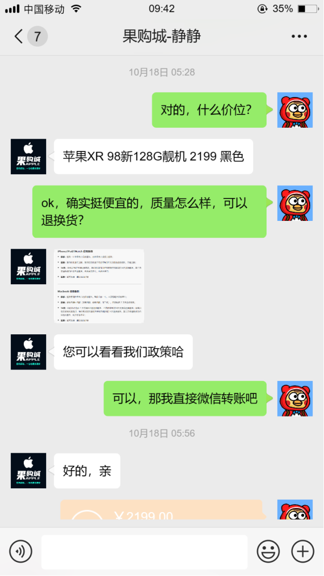 這是在他那里購(gòu)買的蘋果XR 128的,順豐快遞,隔一天就到了,收到貨后,第 一時(shí)間去線下蘋果4S點(diǎn)去驗(yàn)機(jī)了,愛思全綠,安全下車,運(yùn)行速度快,電池98,打游戲看電影很流暢!物有所值,值得信賴!