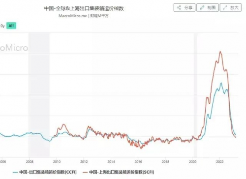 港口堆積成山,主要是因為在疫情初期人力、運(yùn)輸、集裝箱等各方面資源緊缺,價格暴漲就導(dǎo)致供應(yīng)大量增加,集裝箱生產(chǎn)超平時的三倍,所以產(chǎn)能過剩、運(yùn)價暴漲等的情況出現(xiàn)也在意料之內(nèi)。從中國-全球&上海出口集裝箱運(yùn)價指數(shù)表內(nèi)就可以看到,自2022年開始,集裝箱的運(yùn)價就在垂直下降。