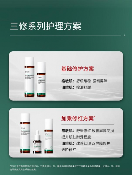 值得一提的是,考慮到不同膚質(zhì)的實(shí)際護(hù)膚需求,DR.WU達(dá)爾膚專門提供了基礎(chǔ)修護(hù)與加乘修紅2兩種護(hù)理方案,痘肌人群可根據(jù)自身膚質(zhì),搭配使用DR.WU達(dá)爾膚三修精華水乳,控油舒緩的同時(shí)讓肌膚屏障更加強(qiáng)韌。而對日常肌膚護(hù)理有進(jìn)階修紅淡印需求的痘肌人群,則可搭配使用三修水乳及三修精華,實(shí)現(xiàn)進(jìn)階加乘修紅淡印功效,輕松度過換季敏感期。