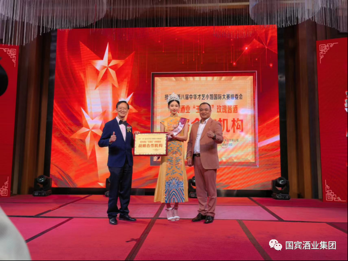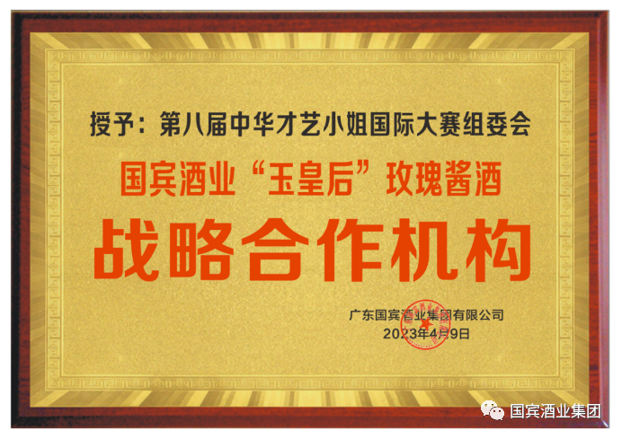 廣東國賓酒業(yè)集團(tuán)與中華才藝小姐國際大賽組委會舉行簽約儀式。并授予中華才藝小姐國際大賽組委會“國賓酒業(yè)玉皇后玫瑰醬酒戰(zhàn)略合作伙伴”