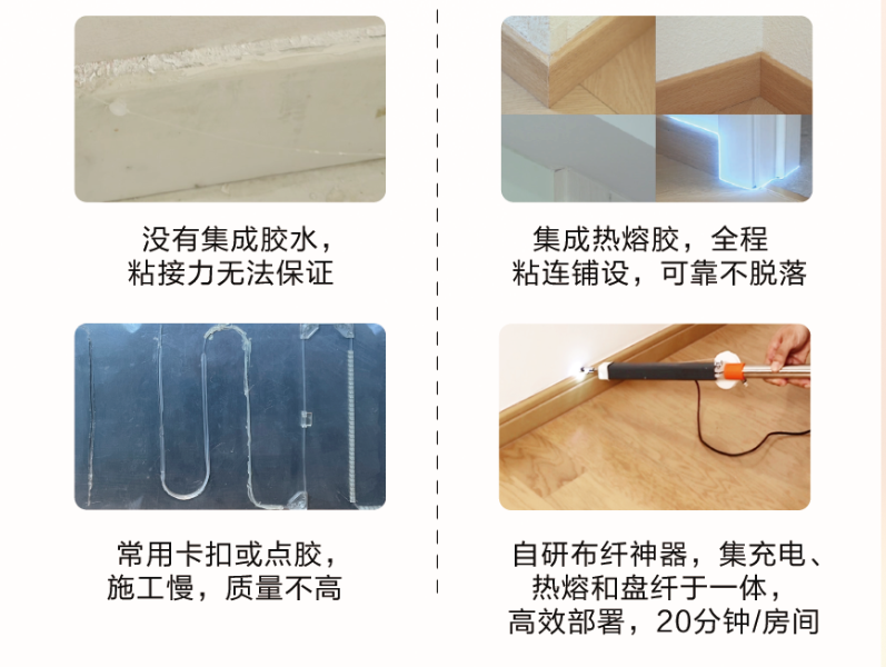 相較沒(méi)有集成膠水、粘接力無(wú)保證的普通透明光纜,其透明光纜不僅自帶“隱身術(shù)”,裝好后絲毫不會(huì)給人一種亂糟糟的感覺(jué),由于集成了熱熔膠,它還支持全程粘連鋪設(shè),減少了后續(xù)脫落的風(fēng)險(xiǎn)。