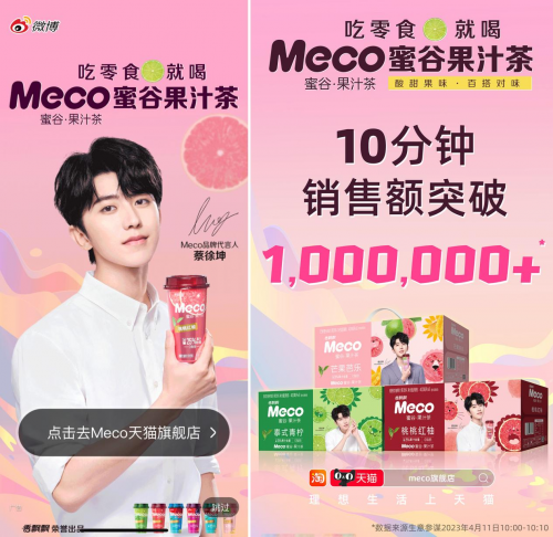 4月11日,Meco蜜谷官宣蔡徐坤為全新品牌代言人,并釋出雙方共同演繹的全新品牌質(zhì)感大片,“酸甜果味,百搭對(duì)味”的Meco蜜谷果汁茶立刻引發(fā)全網(wǎng)跟風(fēng)。