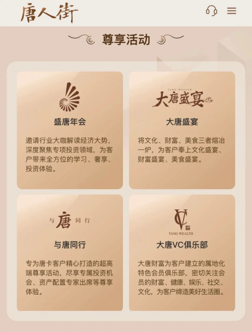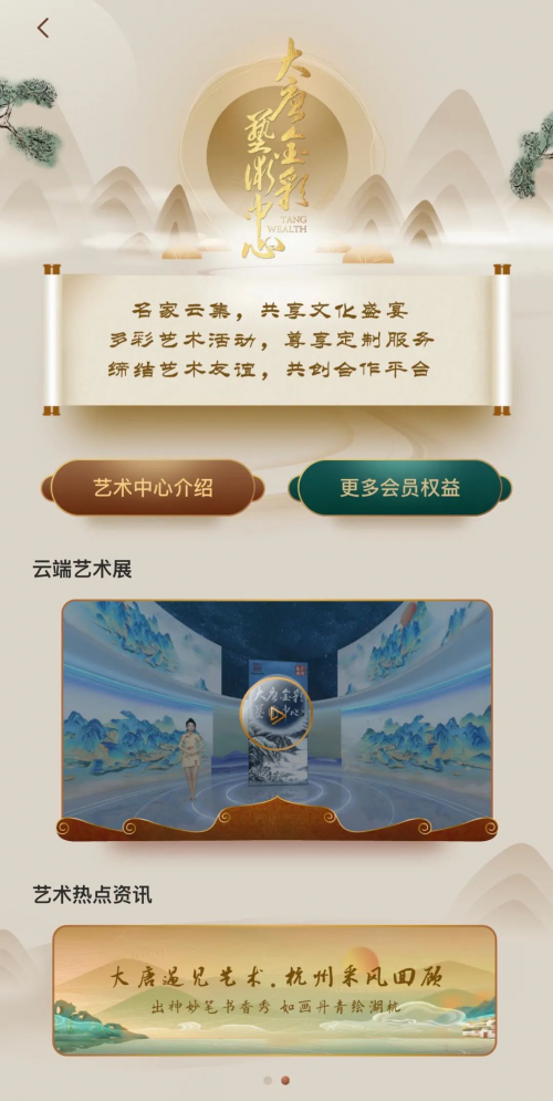 2023年,大唐財富提出“財富管理、健康管理與藝術(shù)文化”三大服務(wù)新生態(tài)?;诖?,唐人街搭建的六大板塊,全面覆蓋了健康、運動、藝術(shù)文化、商旅出行、美容護膚、美食、酒店、消費等服務(wù)場景,實現(xiàn)多場景服務(wù)的全面線上化、生態(tài)化,讓客戶享受金融服務(wù)之余,能夠更加直觀的感受美好生活服務(wù)。