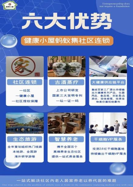 在大健康時(shí)代的力量推動(dòng)下,健康小屋與時(shí)俱進(jìn)、順勢而為,開啟螞蟻集社區(qū)連鎖服務(wù)模式,集古酒蒸療、大健康供應(yīng)鏈平臺(tái)、生態(tài)旅游、智慧養(yǎng)老及干細(xì)胞VIP服務(wù)為一體,一站式解決社區(qū)內(nèi)老人居家養(yǎng)老健康難題。因此,縱觀整個(gè)市場,健康小屋螞蟻集社區(qū)連鎖平臺(tái)的項(xiàng)目優(yōu)勢顯而易見,輕資產(chǎn),輕技術(shù),輕人工是眾多低成本投 資者的不二選擇。