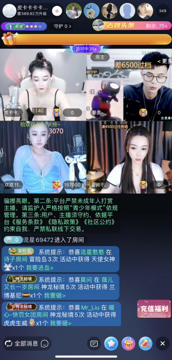流星直播打造全新趣味主播PK,不僅保留了傳統(tǒng)的兩人對決形式,還增加了多人多屏PK互動模式。新模式增加了更多的游戲玩法、趣味挑戰(zhàn)和獎勵機制,使得PK過程更加豐富多樣,讓PK更加有趣,獲得更多快樂!