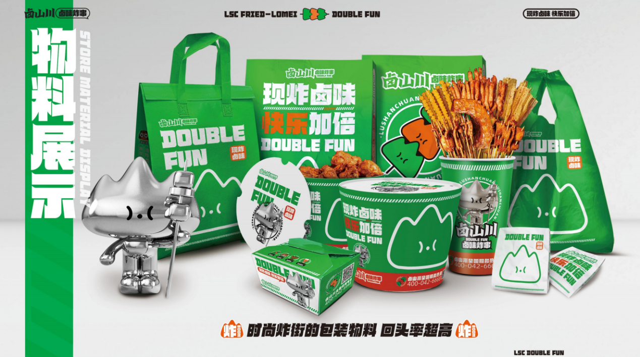 鹵山川選用山川綠為品牌主要色系,給消費者以清新、時尚、健康、不油膩的感覺,外觀采用潮玩時尚風(fēng),高飽和度的綠色即使在百米之外也能一眼鎖定門店,選用橙色和白色作為碰撞色,顏色多彩,搭配炸串讓人食欲滿滿,符合Z時代年輕人活躍的思維和喜好。選擇銀色作為IP形象主色,科技感十足,與產(chǎn)品的創(chuàng)新性相呼應(yīng),更突出品牌的破局形象。