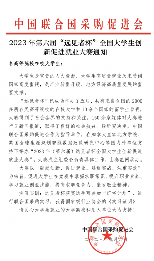 遠(yuǎn)見者杯創(chuàng)辦于2018年,是我國國內(nèi)第一個(gè)以促進(jìn)大學(xué)生就業(yè)為核心目標(biāo)的全國性賽事。近日,為更開、放有力促進(jìn)大學(xué)生就業(yè),經(jīng)過半年的籌備,在中國聯(lián)合國采購促進(jìn)會(huì)指導(dǎo)下全新升級后的2023(第六屆)遠(yuǎn)見者杯全國大學(xué)生創(chuàng)新促進(jìn)就業(yè)大賽正式啟動(dòng)。