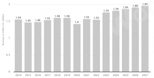 2014年至2027年全球服裝市場收入現(xiàn)狀及趨勢
