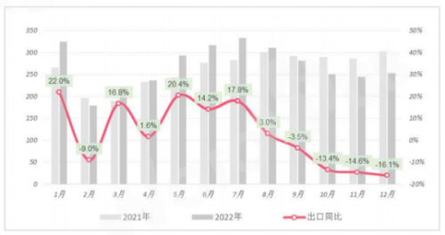 2021-2022年中國紡織品服裝月度出口額及同比增速