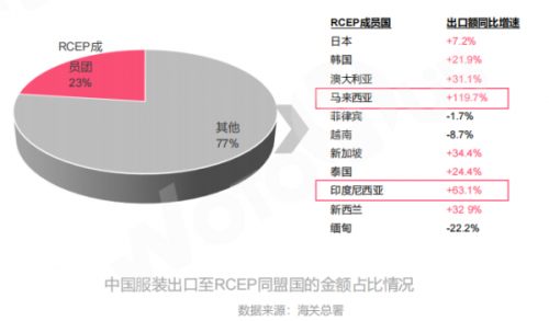 在政策端,因RCEP協(xié)議持續(xù)釋放紅利,東南亞、日韓等經(jīng)濟體需求強盛,中國服裝市場因地緣因素快速滲透。中國服裝出口至RCEP成員過的金額占整體服裝出口額約23%,同盟國中8個國家的出口額同比增速均有所不同程度的上漲。