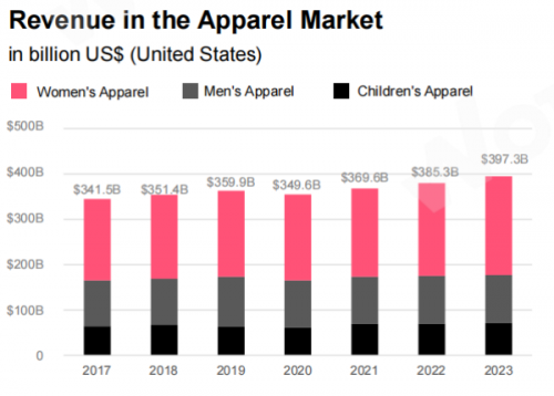 據(jù)statista調查數(shù)據(jù)顯示,全球服裝市場的收入預計將在2023年至2027年間持續(xù)增長2000億美元,增速高達11.49%。預計到2027年,收入達到1.94萬億美元,總體呈現(xiàn)良好的發(fā)展勢頭。僅美國服裝市場收入就高達3120億美元,位居世界第 一。