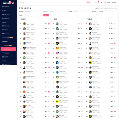 另外,報告還公開了WotoHub海外網(wǎng)紅智能營銷云基于千萬海外紅人資源,對粉絲粘性高的中長尾部紅人分別進行帶貨數(shù)量、互動率、播放量三個維度的排名。品牌在WotoHub內還可在上方導航欄內設置國家、紅人分類、粉絲數(shù)多個篩選條件,以獲得更為精確的榜單排名,實現(xiàn)高效、精準、低成本地鏈接海量帶貨紅人。